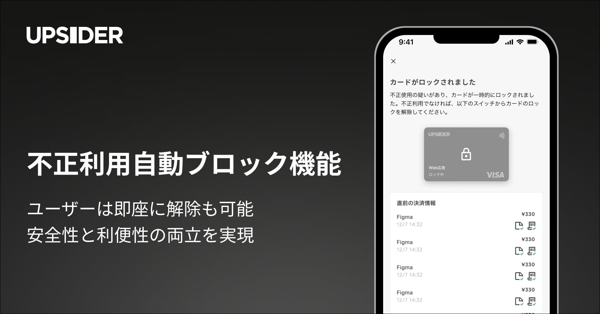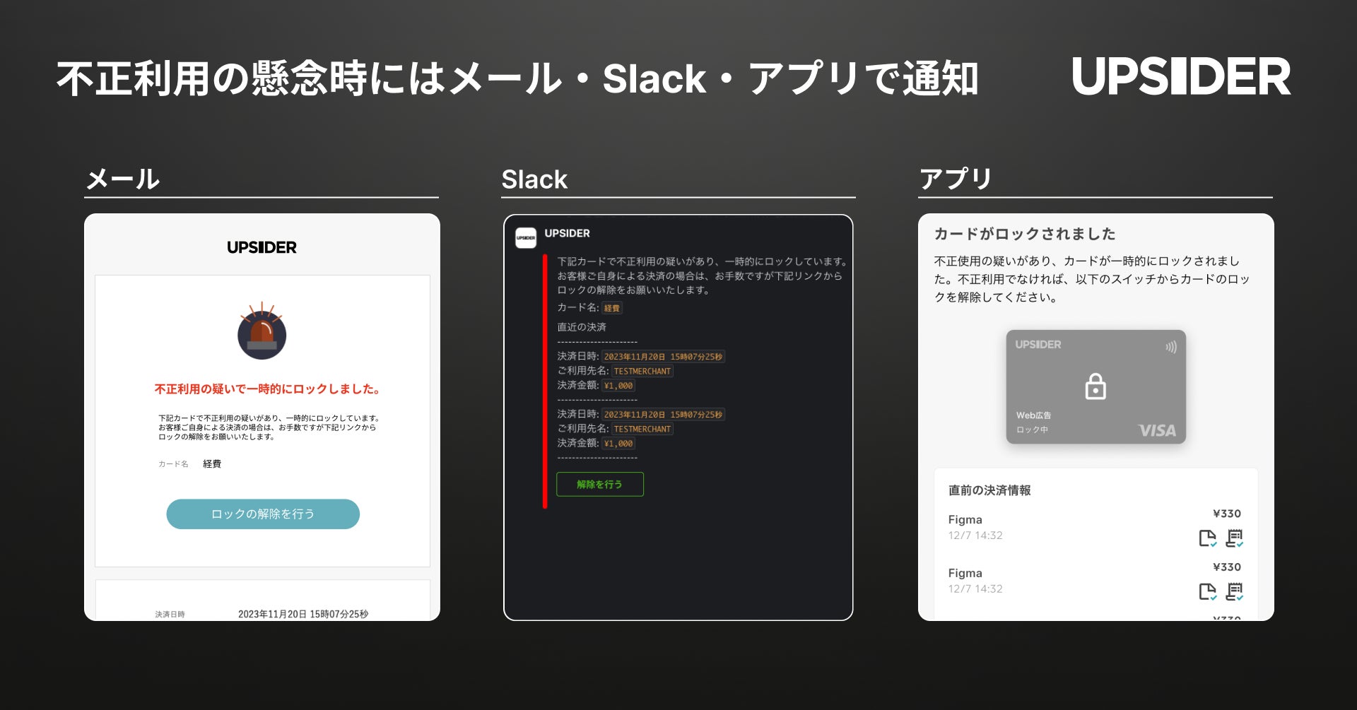 「挑戦者を支える世界的な金融プラットフォームを創る」をミッションに、法人カード「UPSIDER」(以下、UPSIDER)をはじめとする金融サービスを提供する株式会社UPSIDER(代表取締役:宮城徹・水野智規、本社:東京都港区、以下 当社)は、UPSIDERにおける不正利用懸念時の自動・オペレーションによるブロック機能、およびメール、チャット(Slack)、アプリへのロック通知機能、ユーザーによる即時のロック解除機能を新たにリリースしたことをお知らせします。
