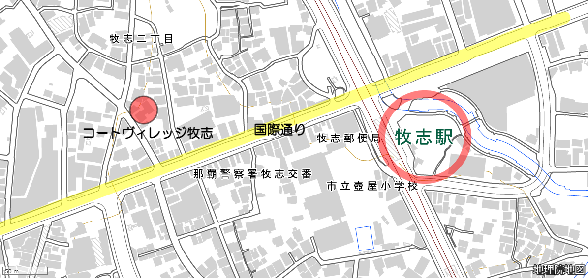 今回の物件は沖縄県の中でも、沖縄都市モノレール線(ゆいレール)の「牧志」駅まで徒歩5分、観光地として賑わう国際通りまで、なんと徒歩2分という好立地となっております。