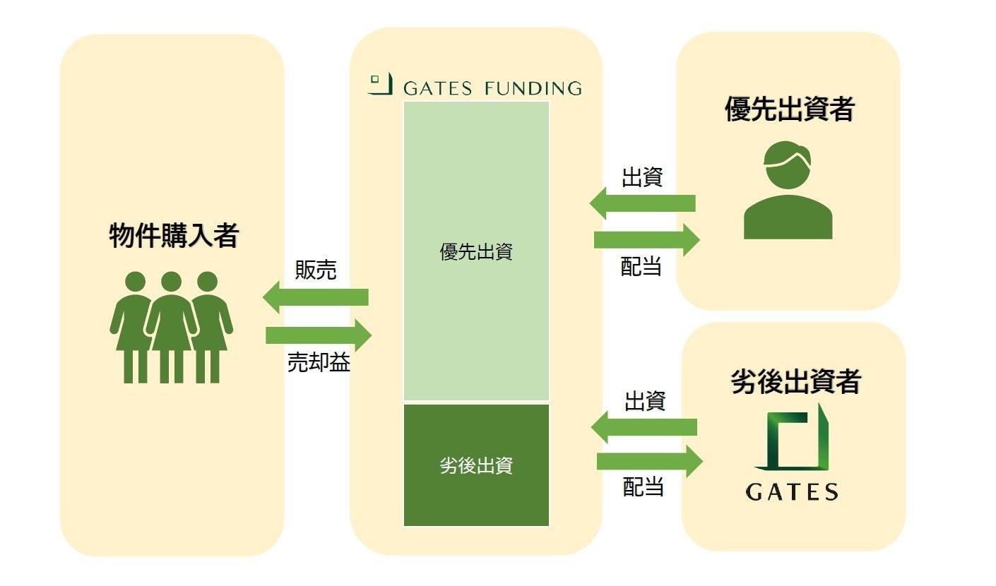 投資家様は優先出資者となり、不動産売却によって得られた利益は、予定の配当利回りに至るまで優先的に分配され、弊社は劣後出資者となり、優先出資者へ分配した後の残った利益が分配されます。