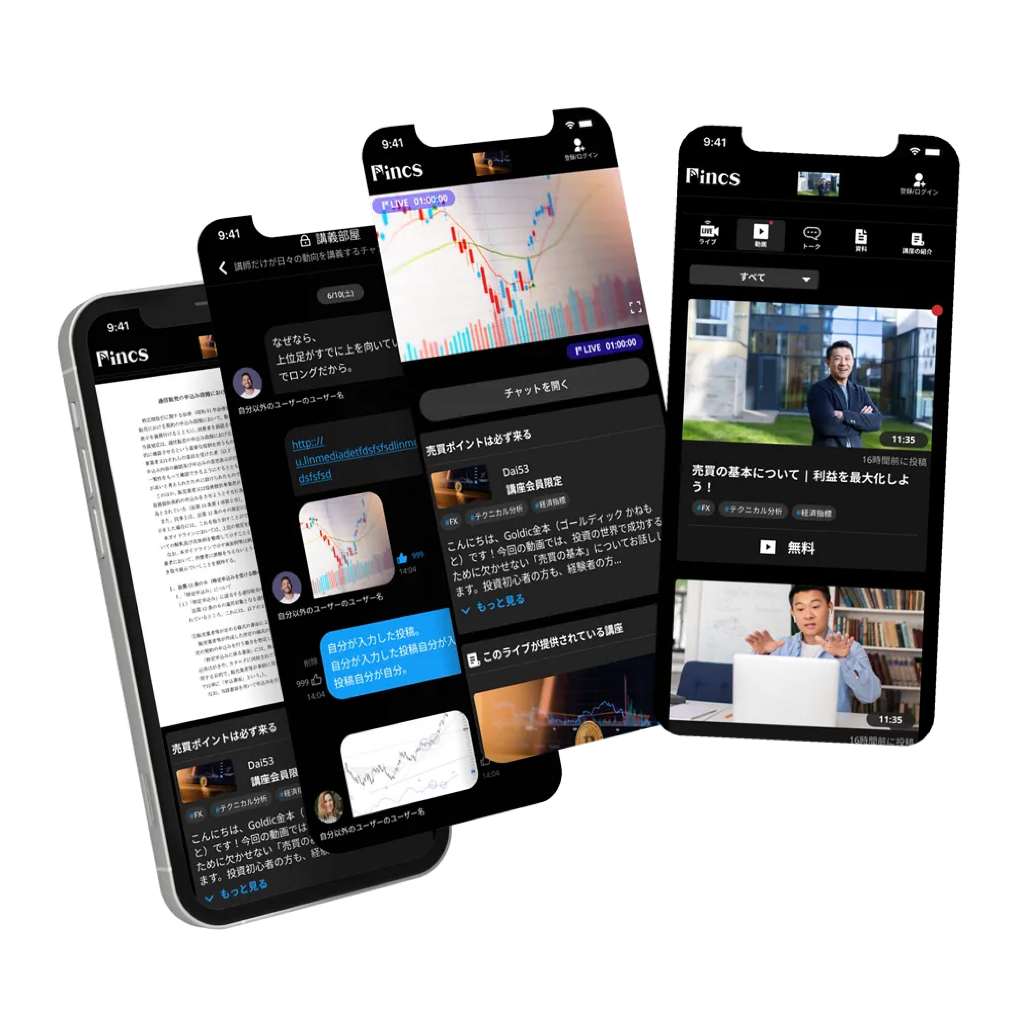 Fincs(フィンクス)は現役投資家から「ライブ」「動画」「チャットトーク」「資料」を通じて実践的で鮮度の高い投資の学習ができる場です。