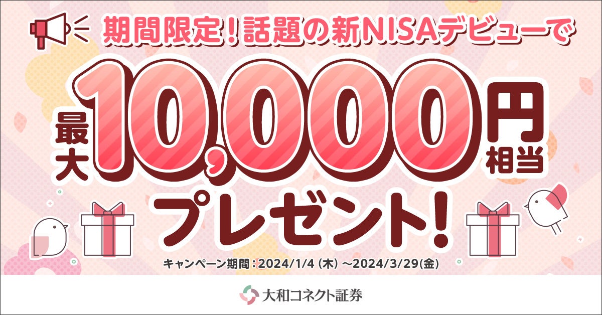 大和コネクト証券株式会社(本社:東京都中央区、代表取締役:大槻 竜児、以下「大和コネクト証券」)では、みなさまの新NISAデビューを応援するため、2024年1月4日(木)~2024年3月29日(金)まで「最大10,000円相当プレゼント!新NISAスタートダッシュキャンペーン!」を実施いたします。