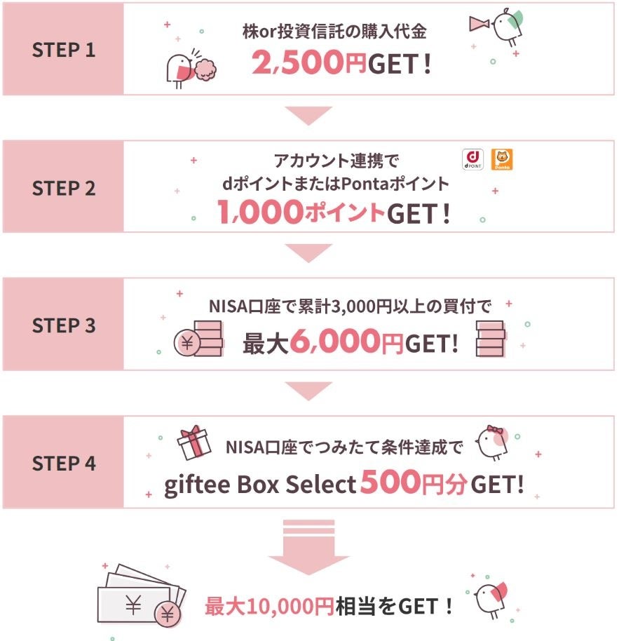 特典①の条件を満たした方※で、NISA口座でつみたて日数20日達成、もしくはクレカ積立での買付を1回以上でgiftee Box Select※ 500円分をプレゼント!
