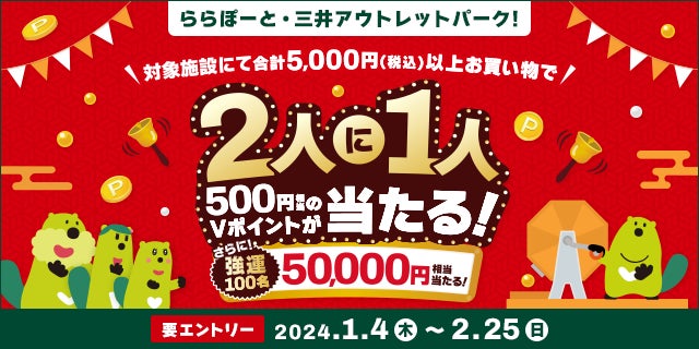 三井住友カード株式会社(本社:東京都江東区、代表取締役社長:大西 幸彦 以下:三井住友カード)は、2024年1月4日(木)より、三井不動産商業マネジメント株式会社(本社:東京都中央区、代表取締役社長:大林 修 以下:三井不動産商業マネジメント)が運営する全国のららぽーと、ラゾーナ川崎プラザ、ダイバーシティ東京 プラザ、ららテラスTOKYO-BAY、ビビット南船橋三井アウトレットパークの対象店舗で期間中5,000円(税込・期間中合算可)以上ご利用いただくと、2人に1人、Vポイントをプレゼントするキャンペーンを開催いたします。