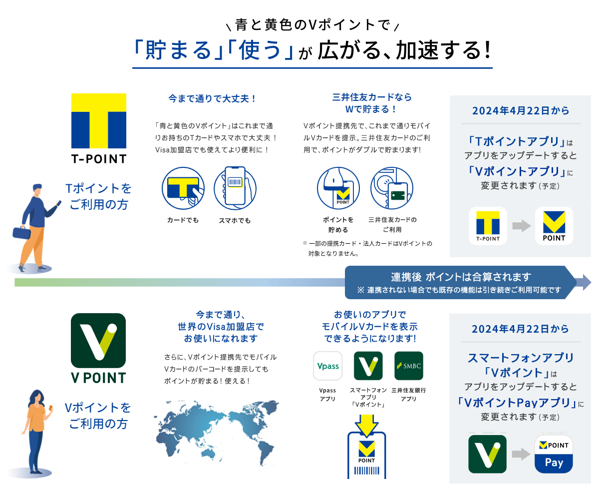 TポイントとVポイントの2つのサービスをご利用されているお客さまは、「Vpassアプリ」、「三井住友銀行アプリ」、『VポイントPayアプリ』などから簡単に両ポイントの連携のお手続きをいただけます。