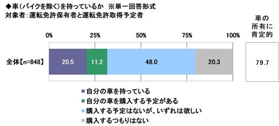 まず、運転免許保有者と取得予定者848名に、車(バイクを除く)を持っているかを聞いたところ、「自分の車を持っている」は20.5%、「自分の車を購入する予定がある」は11.2%、「購入する予定はないが、いずれは欲しい」は48.0%で、合計した『車の所有に肯定的』な方の割合は79.7%となりました。