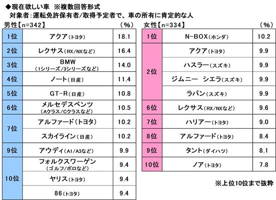 男女別にみると、男性では1位「アクア(トヨタ)」(18.1%)、2位「レクサス(RX/NXなど)」(16.4%)、3位「BMW(1シリーズ/3シリーズなど)」(14.0%)、4位「ノート(日産)」(11.4%)、5位「GT-R(日産)」(10.8%)、女性では1位「N-BOX(ホンダ)」(10.2%)、2位「アクア(トヨタ)」「ハスラー(スズキ)」「ジムニー シエラ(スズキ)」「ラパン(スズキ)」(いずれも9.9%)となりました。