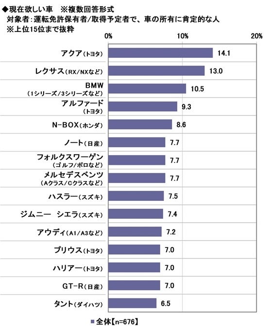 運転免許保有者と取得予定者848名のうち、『車の所有に肯定的』な676名に、現在欲しい車を聞いたところ、1位は「アクア(トヨタ)」(14.1%)、2位は「レクサス(RX/NXなど)」(13.0%)、3位は「BMW(1シリーズ/3シリーズなど)」(10.5%)、4位は「アルファード(トヨタ)」(9.3%)、5位は「N-BOX(ホンダ)」(8.6%)となりました。(※3)。