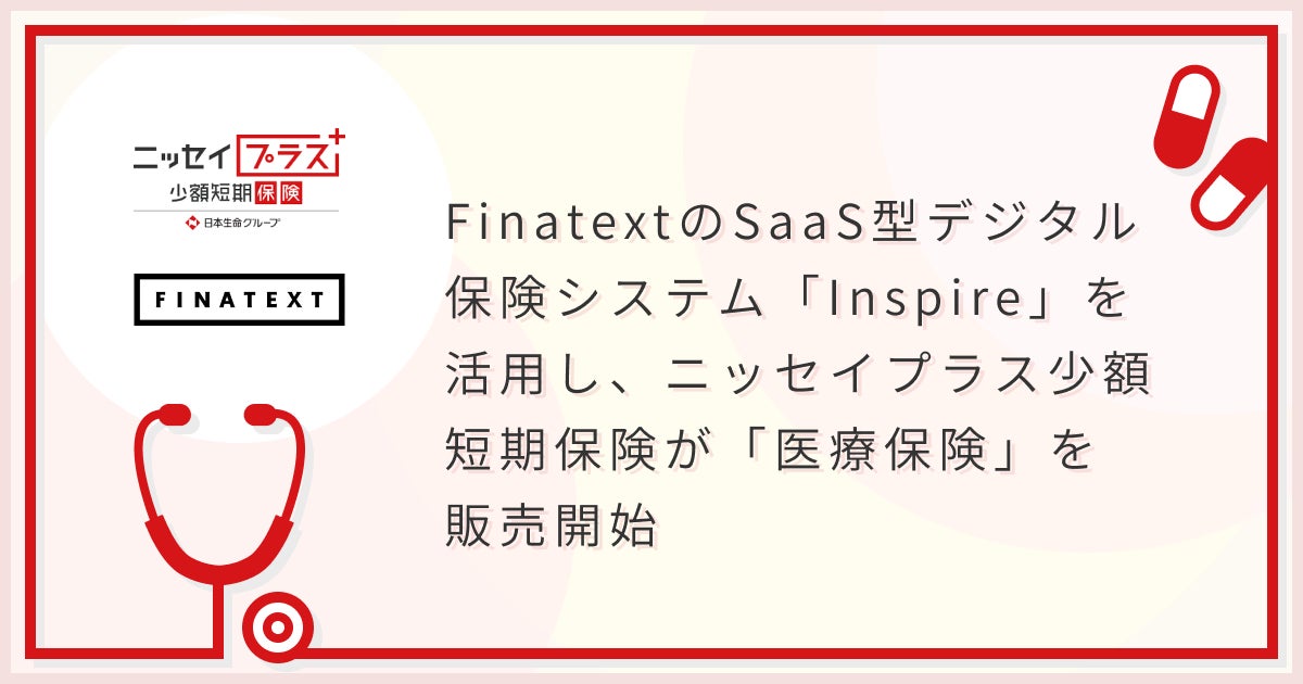 次世代金融インフラの提供を通して組込型金融を実現するFinatextグループの株式会社Finatext(本社:東京都千代田区、代表取締役CEO:木下 あかね、以下「Finatext」)は、ニッセイプラス少額短期保険株式会社(本社:東京都千代田区、代表取締役社長:光本 正、以下「ニッセイプラス」)が、FinatextのSaaS型デジタル保険システム「Inspire(インスパイア)」を活用して「医療保険」を販売開始したことをお知らせします。