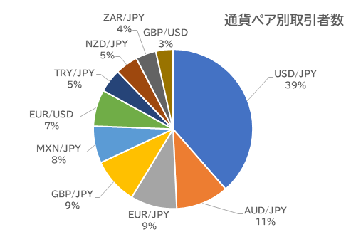 通貨ペア別取引者数のトップ10は、USD/JPY(米ドル/円)・AUD/JPY(豪ドル/円)・EUR/JPY(ユーロ/円)・GBP/JPY(ポンド/円)・MXN/JPY(メキシコペソ/円)・EUR/USD(ユーロ/米ドル)・TRY/JPY(トルコリラ/円)・NZD/JPY(NZドル/円)・ZAR/JPY (南アフリカランド/円)・GBP/USD(ポンド/米ドル)の順。