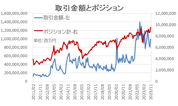 金融先物取引業協会が12月14日に公表した資料によると、2023年11月の店頭FXにおける取引金額は911兆円と、10月から約23.1%増加した。また、月末時点の未決済ポジション合計は約9.6兆円と前月末比10.5%増加し、金額ベースで過去最高を更新した。
