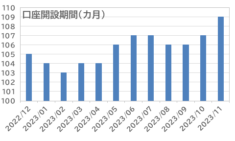 取引をしたFX投資家の口座開設後の期間は、平均109カ月(9年1カ月)へ伸びた。直近2年の平均は101.5カ月(約8年4カ月)となる。