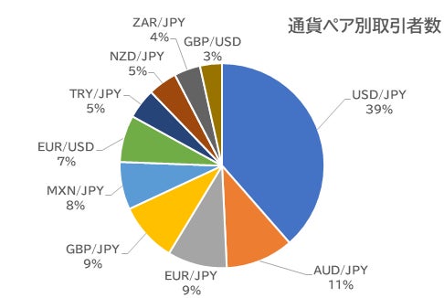 通貨ペア別取引者数のトップ10は、USD/JPY(米ドル/円)・AUD/JPY(豪ドル/円)・EUR/JPY(ユーロ/円)・GBP/JPY(ポンド/円)・MXN/JPY(メキシコペソ/円)・EUR/USD(ユーロ/米ドル)・TRY/JPY(トルコリラ/円)・NZD/JPY(NZドル/円)・ZAR/JPY (南アフリカランド/円)・GBP/USD(ポンド/米ドル)の順。