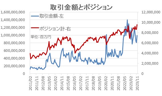 金融先物取引業協会が12月14日に公表した資料によると、2023年11月の店頭FXにおける取引金額は911兆円と、10月から約23.1%増加した。また、月末時点の未決済ポジション合計は約9.6兆円と前月末比10.5%増加し、金額ベースで過去最高を更新した。