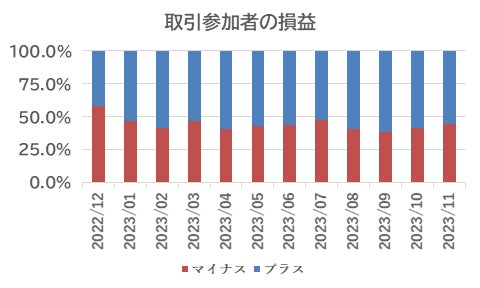 FX取引における実現損益でプラスは55.7%、マイナスは44.2%となった。プラスは前月比2.6%ポイント悪化したものの、個人投資家は今年に入り11カ月連続で収益を確保している。