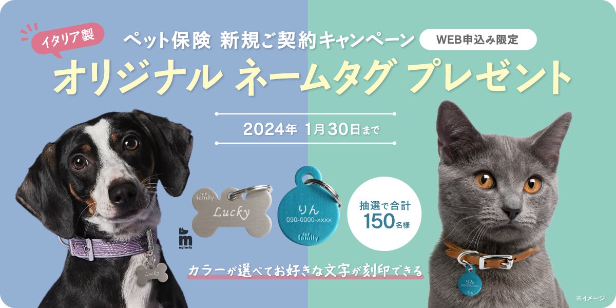 本キャンペーンは、期間中に対象商品にお申込みいただき、ご契約いただいた⽅から抽選で150名様にお好きな⽂字が刻印可能な「My Family社 イタリア製 ネームタグ」をプレゼントいたします。