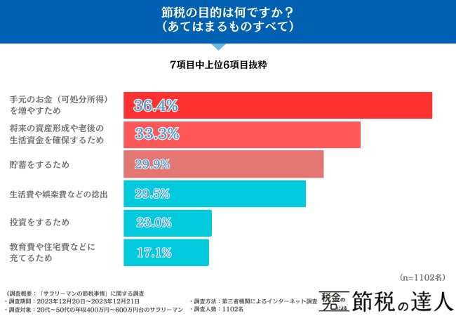 「節税の目的は何ですか?(あてはまるものすべて)」と聞いたところ、最も多かったのは『 手元のお金(可処分所得)を増やすため(56.3%)』と過半数でした。