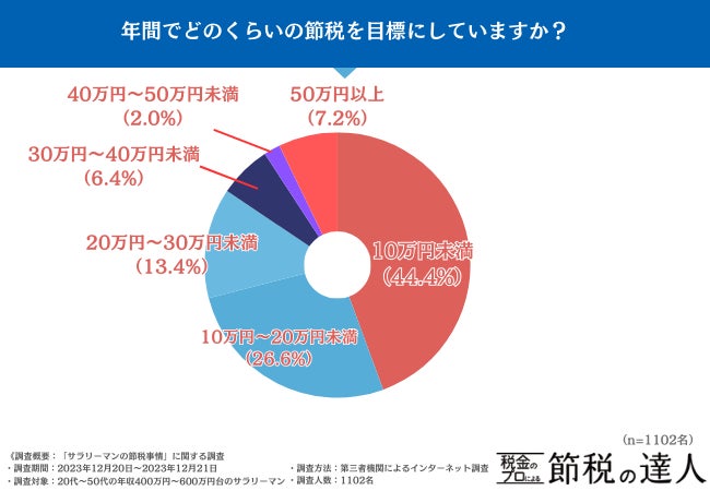 「年間でどのくらいの節税を目標にしていますか?」と質問したところ、『10万円未満(44.4%)』と最多でした。
