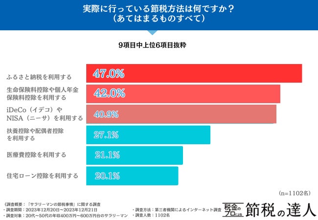 「実際に行っている節税方法は何ですか?(あてはまるものすべて)」と質問したところ、『ふるさと納税を利用する(47.0%)』が最も多い結果となりました。
