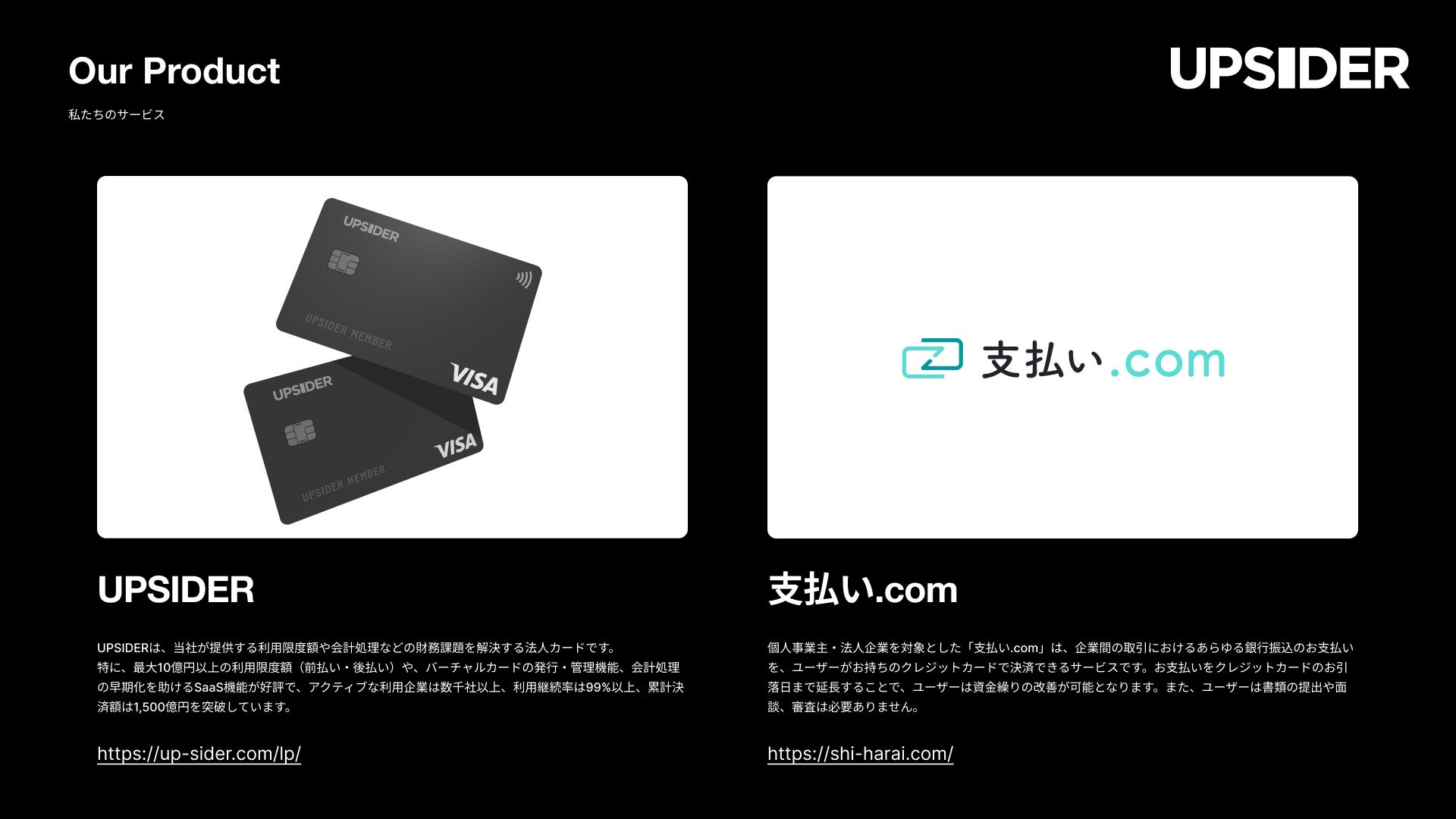 当社は、「挑戦者を支える世界的な金融プラットフォームを創る」をミッションに、法人カード「UPSIDER」およびビジネスあと払いサービス「支払い.com」を提供しており、両サービスの利用社数は35,000社を超えています。