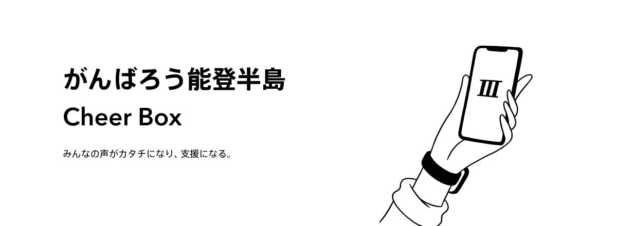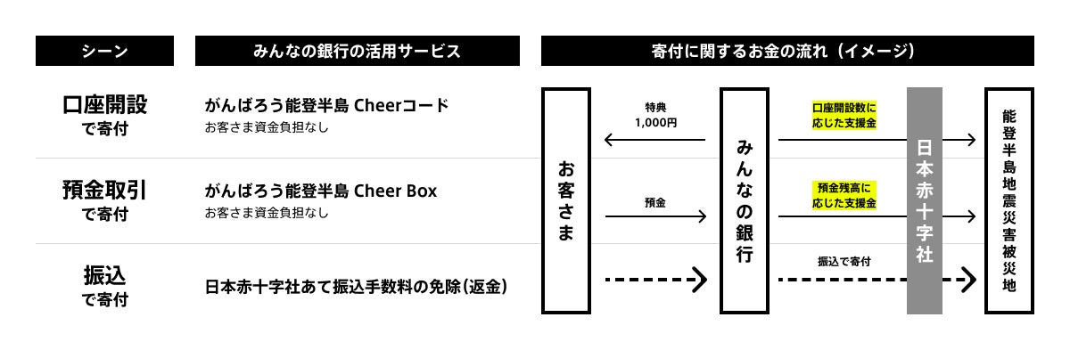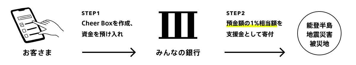 指定の条件で作成されたボックス(貯蓄預金)の預金残高に応じて支援金を届ける「がんばろう能登半島 Cheer Box」と、指定のコードを入力して作成された口座開設数に応じて支援金を届ける「がんばろう能登半島 Cheerコード」の取組みを通じて “みんな”の想いを支援金として被災地に届けます。
