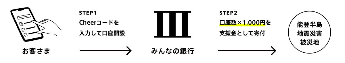 今回の取組みに賛同いただき、みんなの銀行に預金口座を開設いただいた皆さまの想いを被災地に届けるため、「がんばろう能登半島 Cheerコード」をご用意しました。口座開設時に下表に記載のCheerコードを入力すると、寄付金として1,000円がみんなの銀行から日本赤十字社を通じて被災地に届けられ、更には開設されたお客さまの口座(貯蓄預金)に特典として1,000円が入金されます。