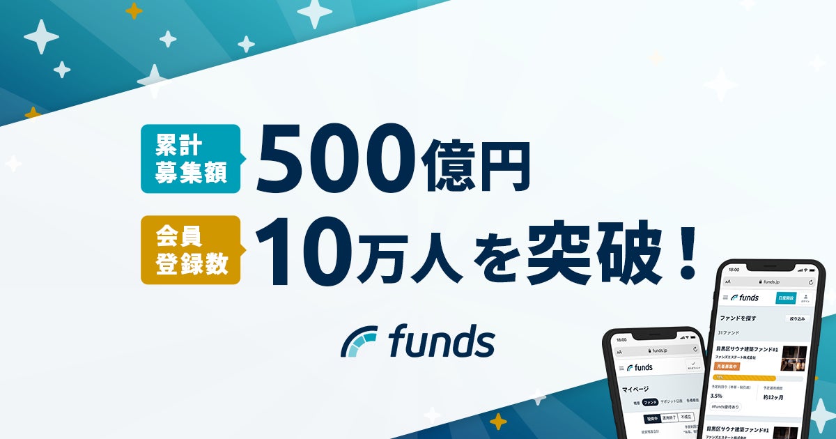 固定利回り投資の資産運用サービス「Funds(ファンズ)」を運営するファンズ株式会社(本社:東京都渋谷区、代表取締役CEO:藤田雄一郎、以下 当社)は、2023年12月時点で、2019年1月のFundsサービス開始以来の累計募集額が500億円を突破、また、会員登録数が10万人を突破したことをお知らせいたします。