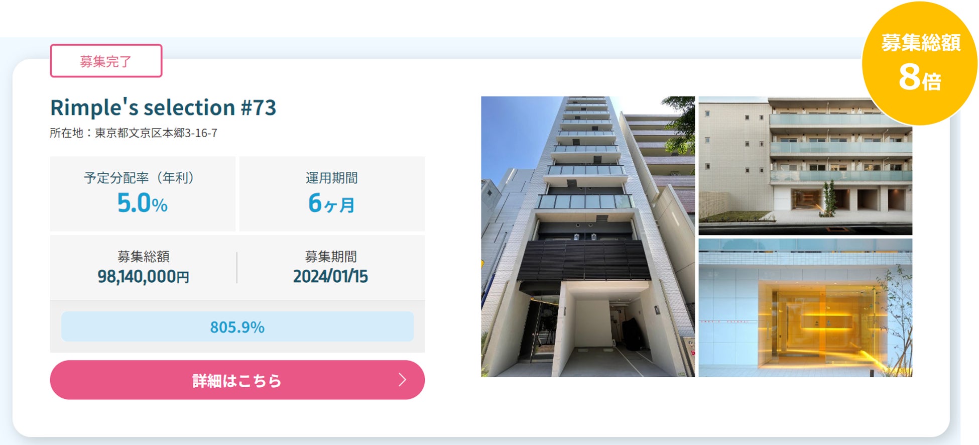 本ファンドは、年利が通常ファンドの約2倍の5.0%となっていたこともあり、最近の応募倍率2倍~3倍と比較すると、応募倍率比で3倍ほどのご応募を頂戴しました。