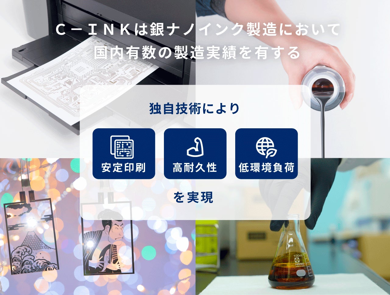 「C-INK」の3つの注目ポイント ・エレクトロニクス産業で普及が期待される「銀ナノインク」で国内有数の製造実績 ・これまで困難だった電子回路の安定的かつ高精度なインクジェット印刷を可能にする技術優位性 ・信頼性の高さや多品種生産の容易さで、NASDAQ上場でGPS関連機器の世界大手Garminなどで採用 |