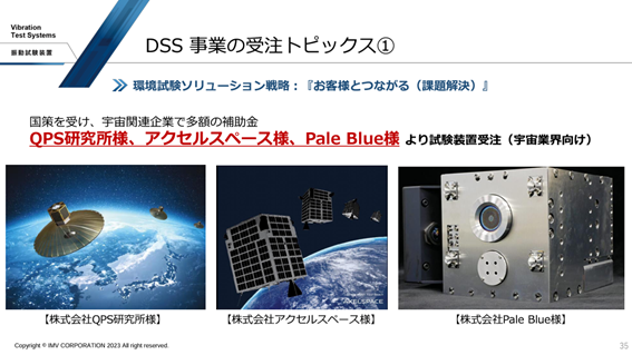 振動シミュレーションシステム(DSS)にもまだまだ成長余地があります。検査する対象が、人工衛星、ロケットなどにも広がってきています。IMVは、日本の全てのロケットベンチャーとビジネスをしていて、2022年には、北海道に本社があるロケットベンチャー、インターステラテクノロジズ社にも出資しています。<https://www.imv-global.com/imvuploader/data/MjAyMjAxMjUxMjU5MzNJU1TnpL7jgbjjga7lh7ros4fjgavplqLjgZnjgovjgYrnn6XjgonjgZsucGRm.pdf>国際競争という観点からも、何としてもこの分野を支えていきたいと思っています。