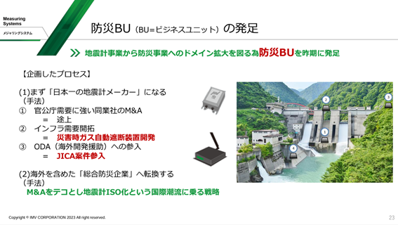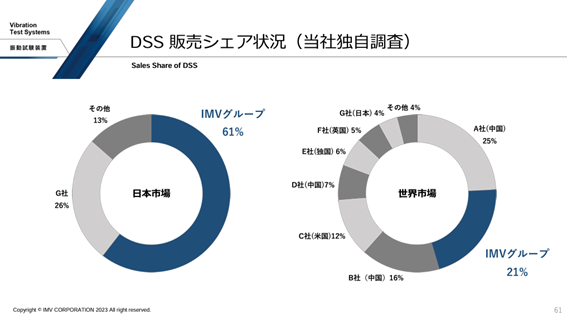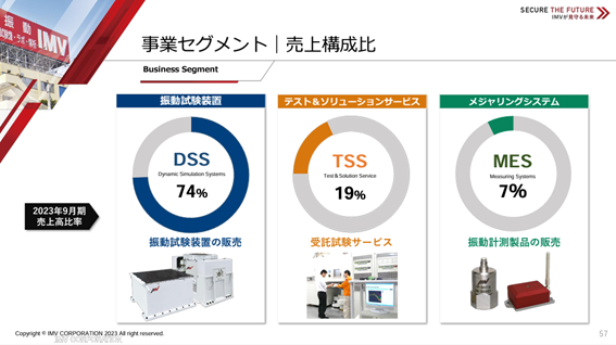 小嶋社長)短信ではセグメント分けできていませんが、説明会資料を見てもらうとわかるように、IMVには3つのセグメントがあります。振動シミュレーションシステム(DSS)、テスト&ソリューションシステム(TSS)、メジャリングシステム(MES)です。以下の図を見てもらうとわかるように、これまでは、祖業のDSSの売上高が70%以上でしたが、他のセグメントも伸びてくることをイメージしています。まだまだ伸びしろは一杯あります。