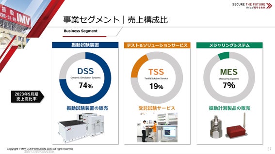小嶋社長)短信ではセグメント分けできていませんが、説明会資料を見てもらうとわかるように、IMVには3つのセグメントがあります。振動シミュレーションシステム(DSS)、テスト&ソリューションシステム(TSS)、メジャリングシステム(MES)です。以下の図を見てもらうとわかるように、これまでは、祖業のDSSの売上高が70%以上でしたが、他のセグメントも伸びてくることをイメージしています。まだまだ伸びしろは一杯あります。