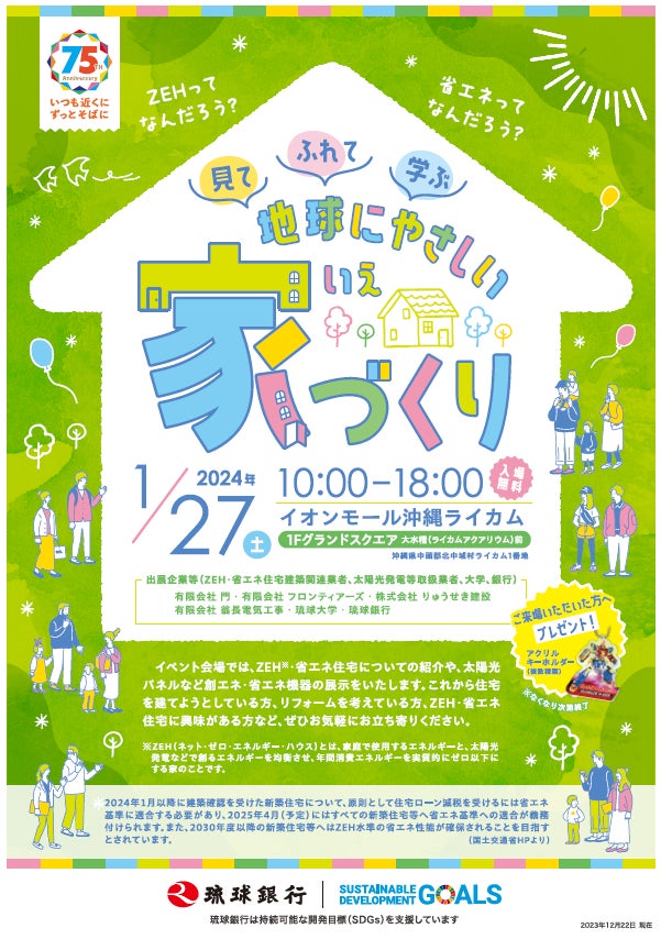 琉球銀行(頭取 川上 康)は、2024年1月27日(土)に、イオンモール沖縄ライカムにて、ZEH・省エネ住宅関連イベント「見て ふれて 学ぶ 地球にやさしい家づくり」を開催いたします。