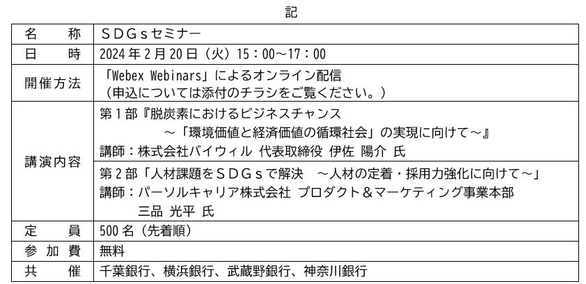 千葉銀行(頭取 米本 努)は、2024年2月20日(火)、「千葉・横浜パートナーシップ」を組むコンコルディア・フィナンシャルグループの横浜銀行(頭取 片岡 達也)、神奈川銀行(頭取 近藤 和明)および「千葉・武蔵野アライアンス」を組む武蔵野銀行(頭取 長堀 和正)と、SDGs経営の向上に取り組んでいる事業者の皆さまを対象とした「SDGsセミナー」を共催します。