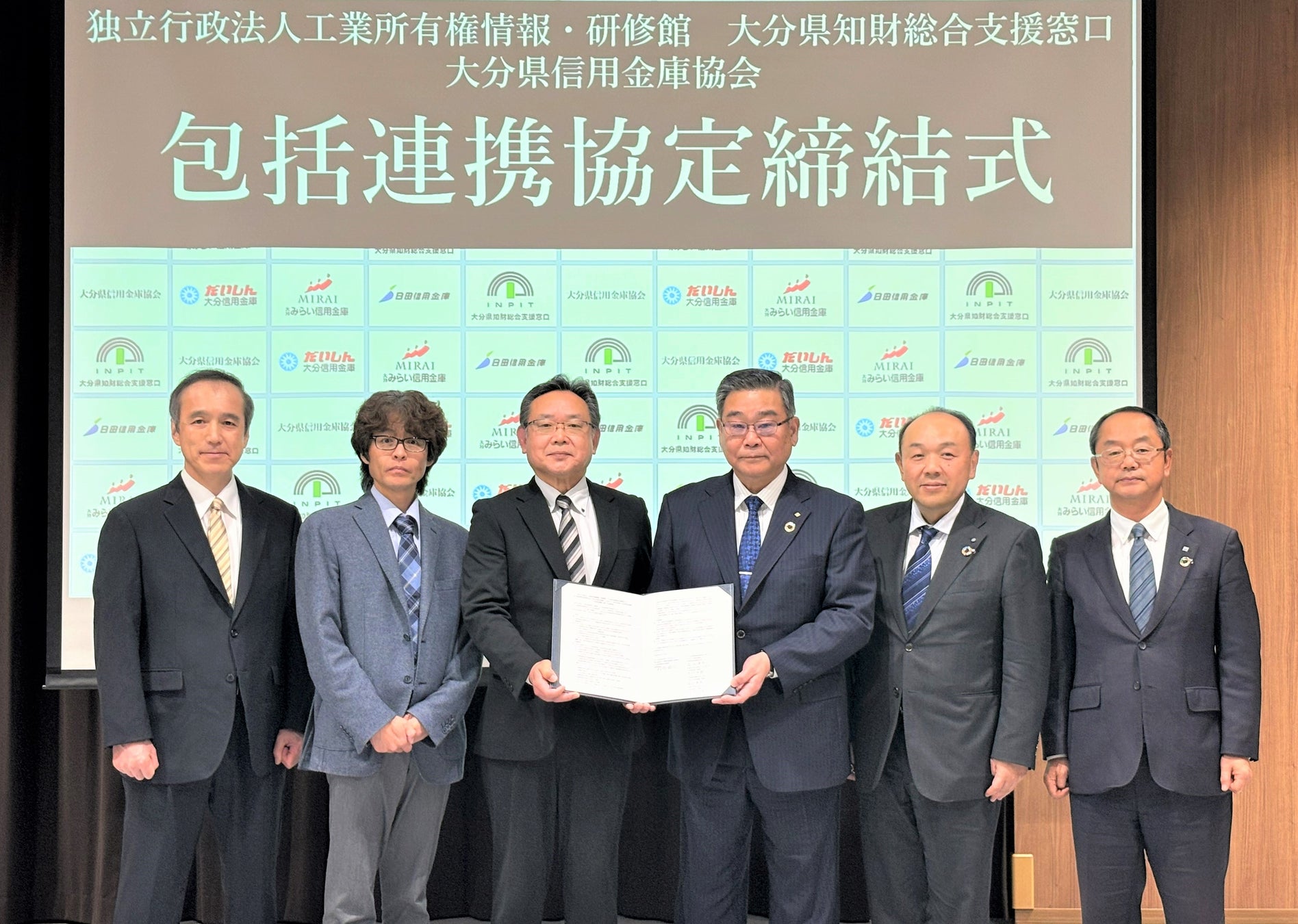 令和6年1月19日、INPIT(インピット)大分県知財総合支援窓口は、大分県信用金庫協会並びに大分信用金庫、大分みらい信用金庫、及び日田信用金庫との間で包括連携協定を締結した。