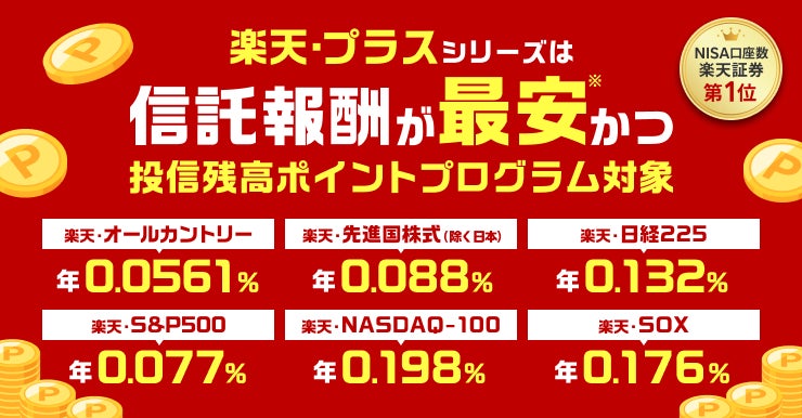 今回、「投信残高ポイントプログラム」に新たに追加するのは、楽天投信投資顧問株式会社(本社:東京都港区、代表取締役社長:東 眞之、以下「楽天投信投資顧問」)が運用するインデックスファンド、「楽天・プラス」シリーズの投資信託です。同シリーズは、原則、信託報酬率を機動的に引き下げるなど、同種の投資信託の中で業界最安水準(※1)の信託報酬で運用することを目指しており、今回追加する2商品においても同様に、業界最安水準(※1)の信託報酬で運用・提供をおこなうことを目指します。