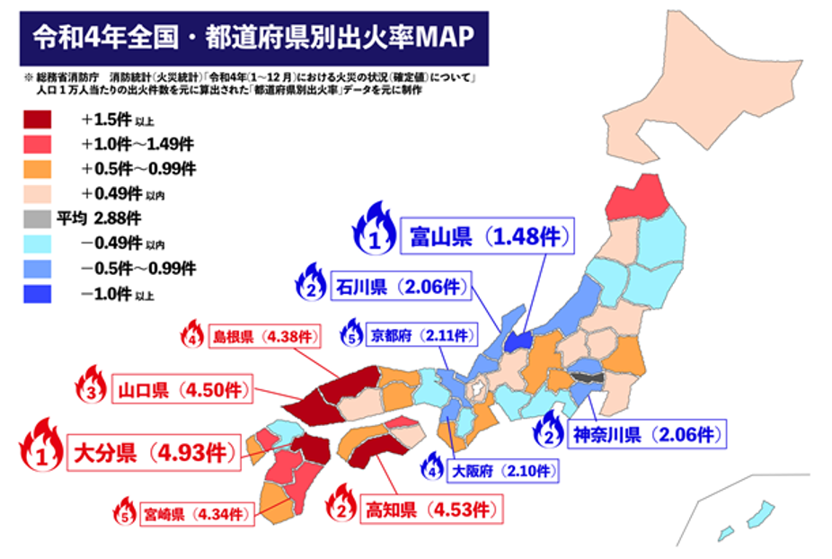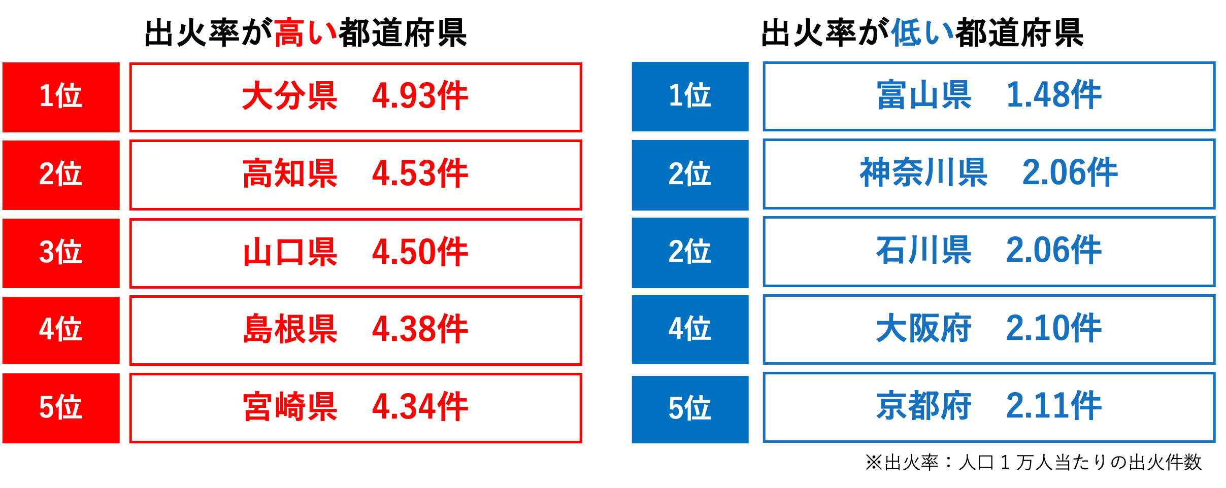 都道府県ごとの出火率を確認すると、出火率が1番高いのは大分県(4.93件)であることが分かりました。続いて高知県(4.53件)、山口県(4.50件)、島根県(4.38件)、宮崎県(4.34件)という結果となり、1位から5位の県が西日本に属しており、西日本の出火率が高い傾向であることがわかります。