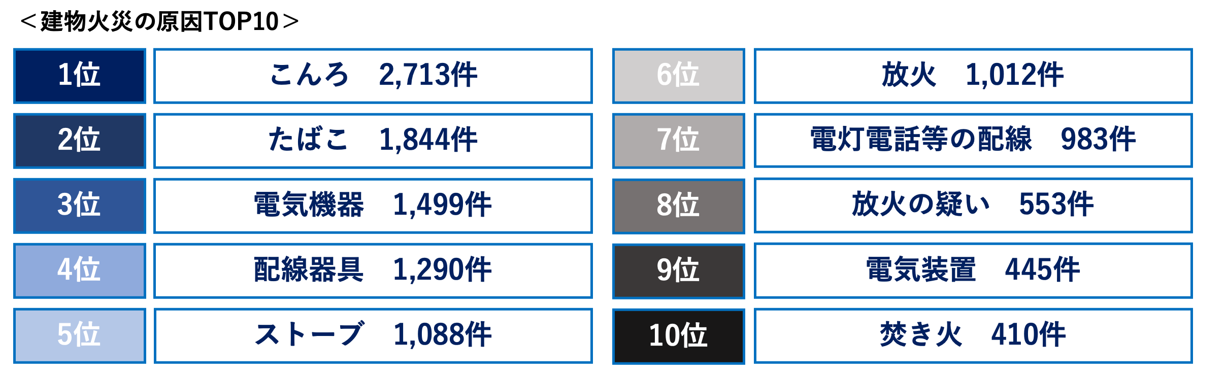 建物火災の原因は「たばこ(1,844件)」、「電気機器(1,499件)」「配線器具(1,290件)」が上位を占めていますが、建物火災で最も多いのは「こんろ(2,713件)」による火災です。こんろで火を扱う際には、周囲に燃えやすいものを置かないことや、調理の際、火が鍋底からはみ出さないように調節するなど日頃から注意して火を扱いましょう。また寒い時に活躍する電気ヒーターやこたつ、たばこも火災の原因となることが多いです。近年テレワークが普及しており、パソコンを自宅で使用する機会も増えているので、コンセントにホコリが溜まっていないかなど、配線器具の取扱いにも注意が必要です。