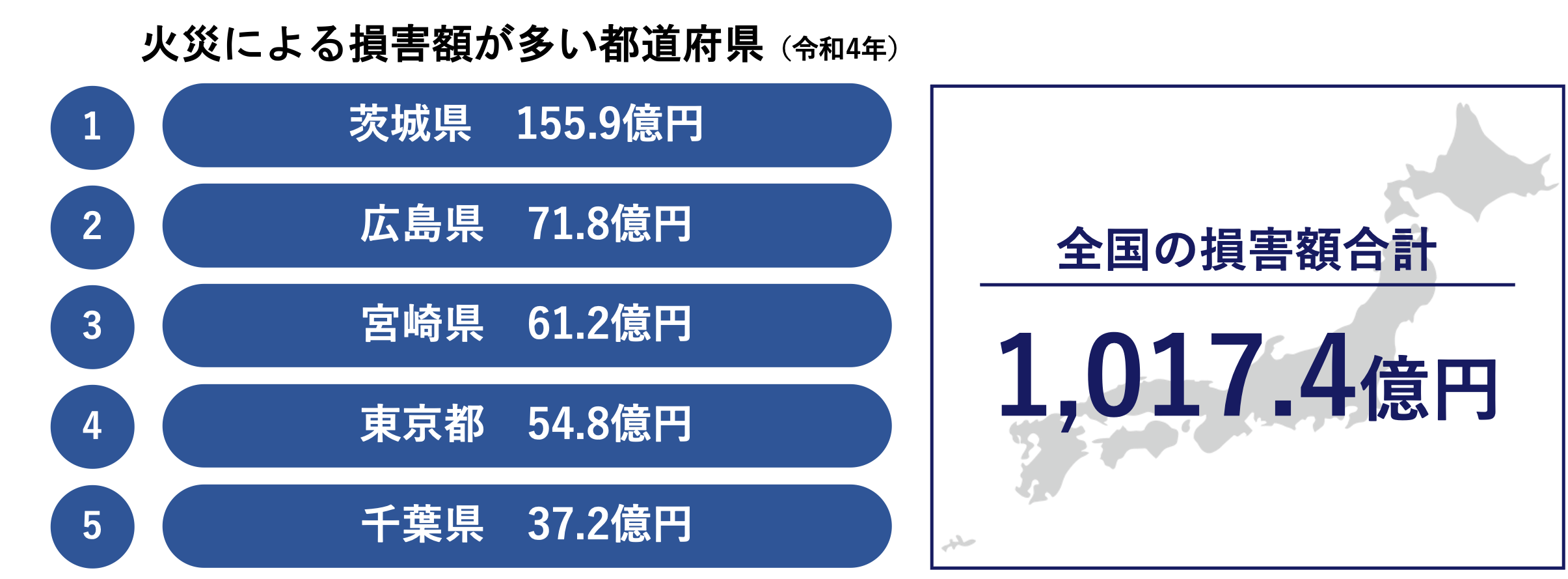 火災による損害額に注目すると、茨城県が155.9億円と令和4年では最も大きい損害額となりました。また出火率と損害額の両方で宮崎県が上位に入っています。