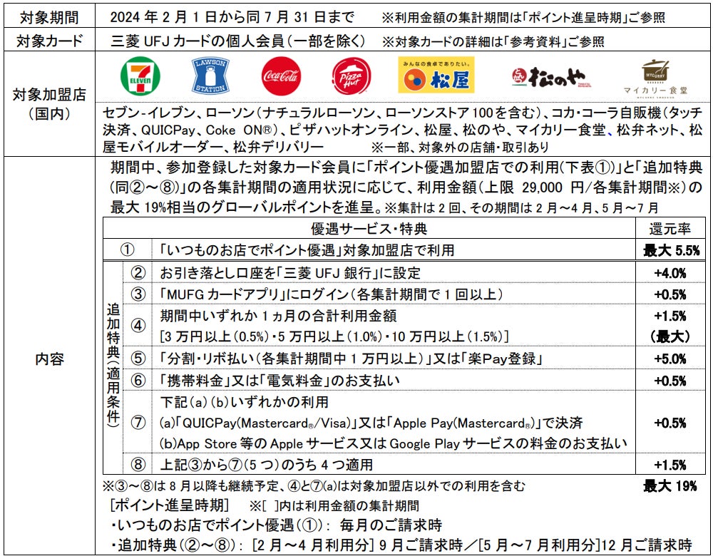 本企画は、「三菱UFJカード」の利用で最大5.5%相当のポイントが貯まる“いつものお店でポイント優遇”に加え、お引き落とし口座への「三菱UFJ銀行」の設定(+4.0%)や「MUFGカードアプリ」へのログイン(+0.5%)等7つの追加特典(下表②~⑧)で構成。各ポイント優遇加盟店での利用1,000円につき、“最大5.5%”の他に各特典の適用条件に応じて最大13.5%相当のポイントが加算(※2)される仕組みで、合わせて最大19%相当のポイントが貯まるものです。