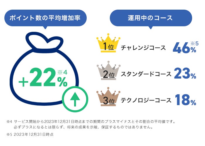 「ポイント運用」サービス開始時点から2023年12月31日時点でポイント運用者のポイント数の平均増加率は+22%(※4)となっています。また、運用中コースでは、米国の代表的な株価指数に連動して約3倍の値動きをする「チャレンジコース」が残高ベースで最多となり、46%を占めています(※5)。