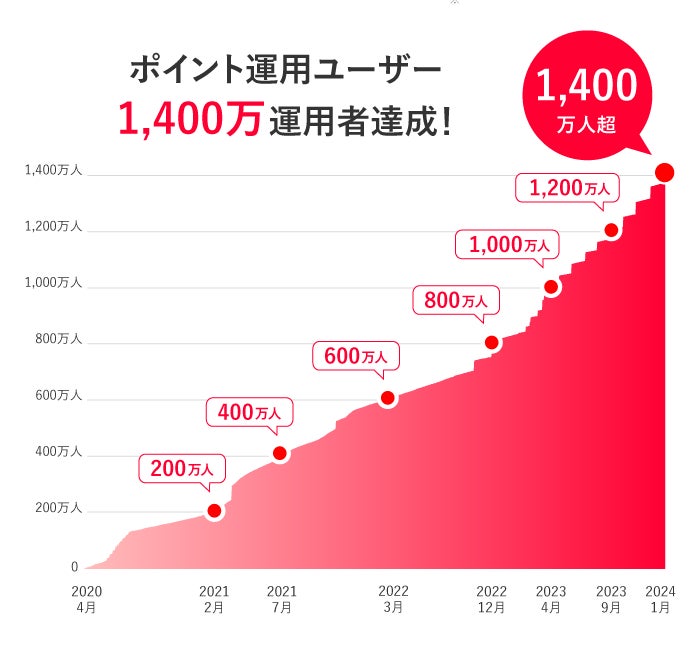 「ポイント運用」の運用者数は、サービス提供開始から約3年となる2023年4月に1,000万人を突破し、その後もさらに多くの方にご利用いただいています。このたびの1,400万運用者突破は、ポイント運用サービスを提供する主要なポイント運用サービス取扱業者での業界最大規模をさらに更新しました(※3)。