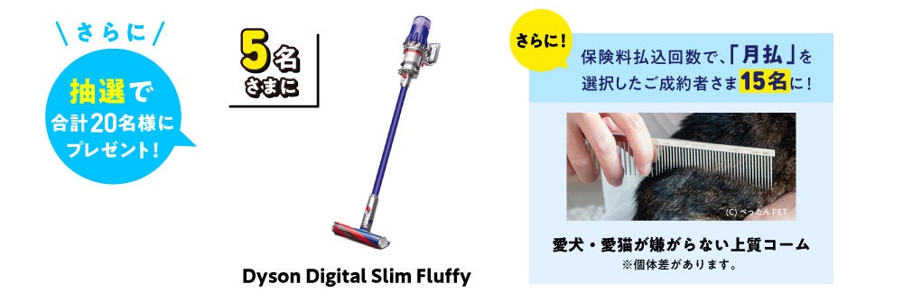 ご成約者さま全員 ・サーティワン 200円デジタルギフト ※一部利用対象外の店舗がございます。 ※機器の故障や清掃などによりご利用いただけない場合がございます。 ご成約者さま全員の中から抽選 ・ダイソン Dyson Digital Slim Fluffy (SV18 FF H) 5名様 「月払」を選択いただいたご成約者さまの中から抽選 ・ぺったんPET 愛犬・愛猫が嫌がらない上質コーム 15名様 ※商品の機能に関するお問合せはメーカーさまへお願いいたします。 ※カラーは当社におまかせください。 ※「ぺったんPET 愛犬・愛猫が嫌がらない上質コーム」は個体差があります。 |