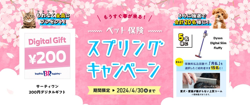 本キャンペーンでは、期間中にペット保険にお申込みいただいたご成約者さま全員に、「サーティワン 200円デジタルギフト」をプレゼントします。また、抽選で5名様に人気の掃除機が当たるほか、保険料払込回数で「月払」を選択いただいたご成約者さまの中から抽選で15名様に人気のペット用品が当たります。