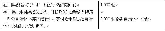 株式会社福邦銀行(本社:福井県福井市、代表取締役頭取:湯浅 徹)と株式会社RCG(本社:東京都中央区、代表取締役:天間 幸生)は、自治体向けに企業版ふるさと納税の活動を行っており、今回の令和6年能登半島地震により甚大な被害が生じている被災地支援のため、企業版ふるさと納税を通じて、株式会社ジョウマ(本社:沖縄県那覇市、代表取締役 城間茂広)様より、塩と水で発電する軽量小型ランタン「ソルピカ」10,000個の物納寄付が行われますことをお知らせいたします。