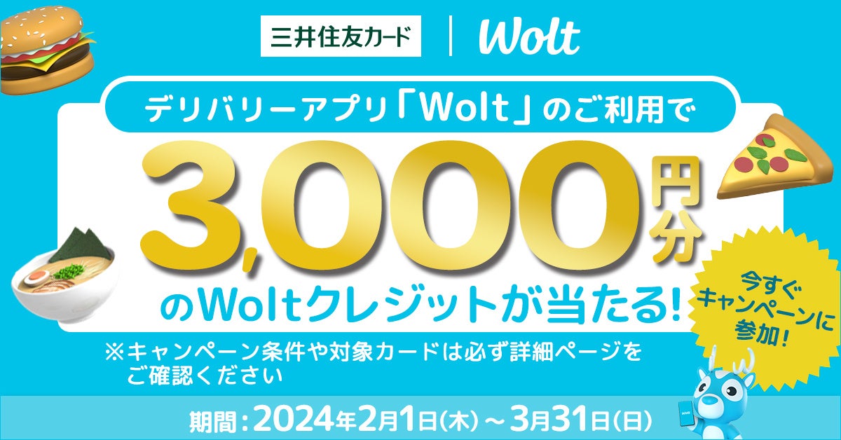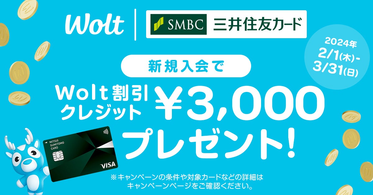 本キャンペーンページから三井住友カードの対象カードに新規ご入会いただくと、3,000円分のWolt割引クレジットがもらえる!