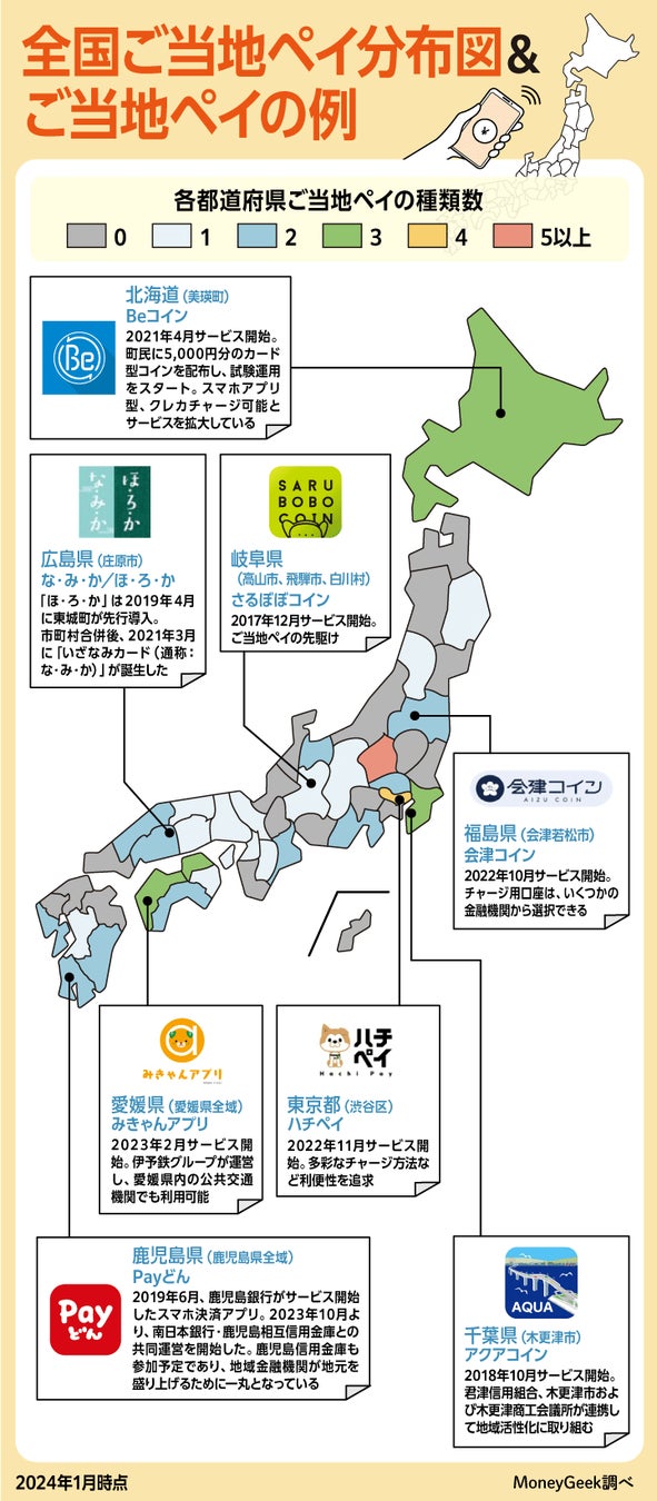 2024年1月時点で、全国のご当地ペイは約60種類(編集部調査)。運営を検討している自治体等もあるため、今後も拡大することが予想されます。
