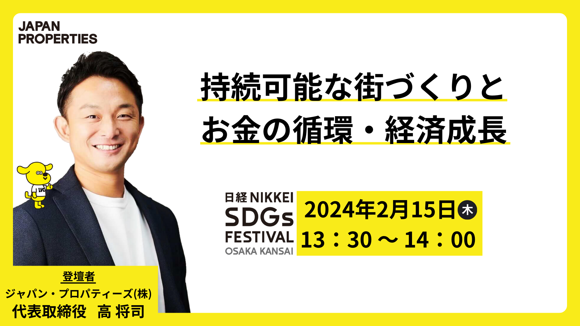 不動産クラウドファンディング「LEVECHY」やオフィス再生事業「JP-BASE」を展開する当社は、2024年2月15日(木)開催のDay2にて、『万博とまちづくり』をテーマに、当社が考える「持続可能な街づくりとお金の循環・経済成長」について講演いたします。