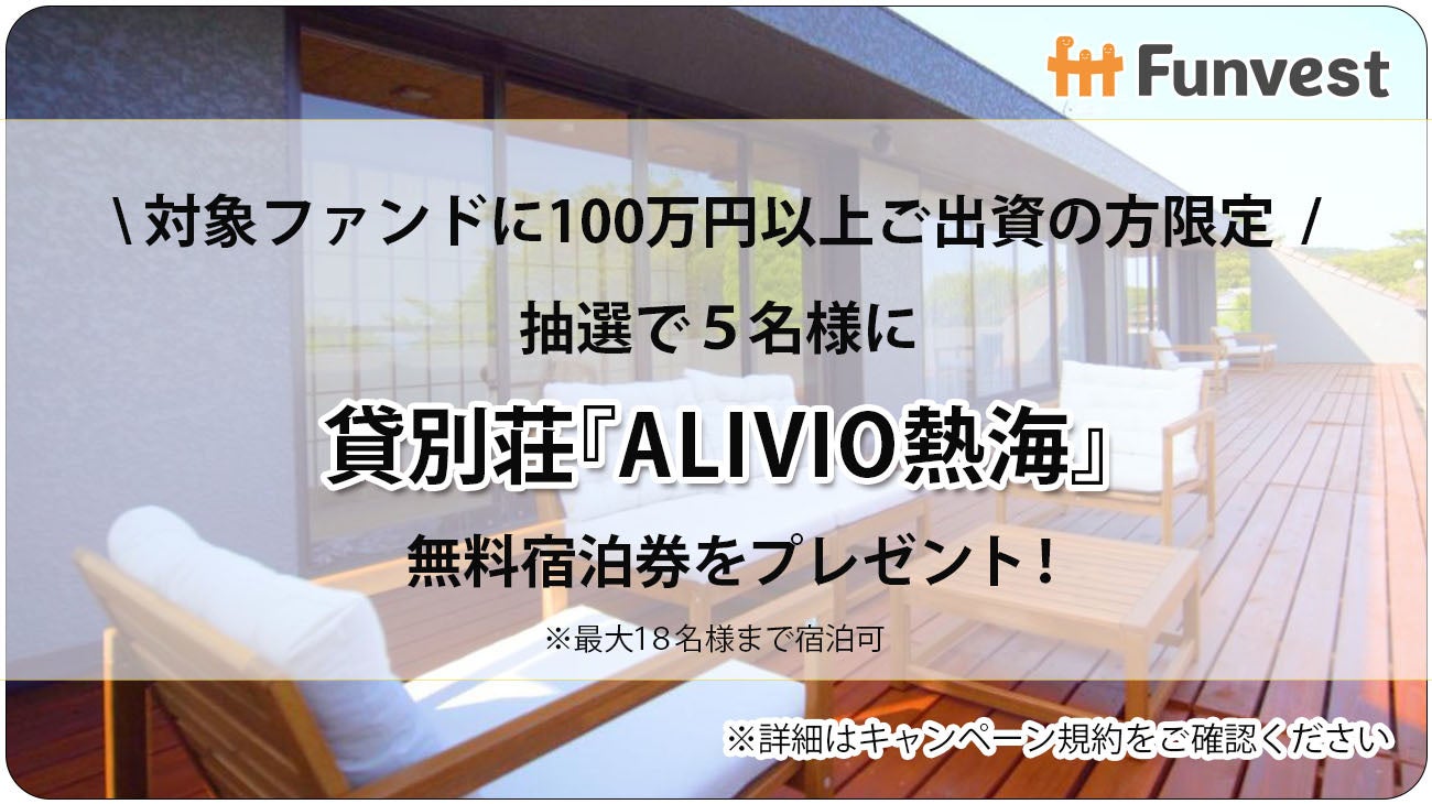 本ファンドに100万円以上ご出資の方を対象に、株式会社カワムラ建設が運営する貸別荘『ALIVIO熱海』の無料宿泊券を抽選で5名様にプレゼントいたします。