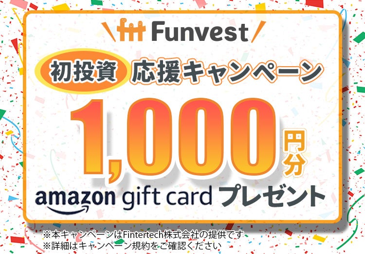 過去にFunvestでの投資経験がない方の初投資で、もれなく1,000円分のAmazonギフトカードをプレゼントするキャンペーンを併せて実施いたします。