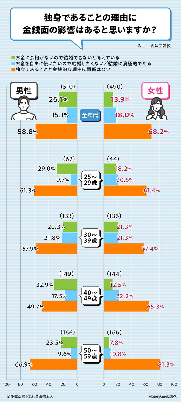 男性の58.8%と女性の68.2%が、お金がないから結婚できないとは考えていないようです。